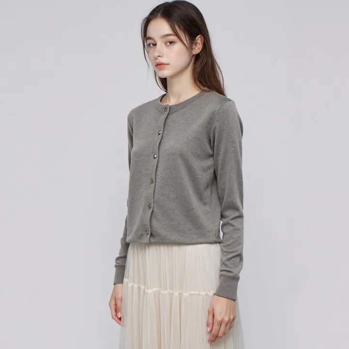 25年秋の新商品で、柔らかい素材と金色のボタンがポイントのラウンドカーディガン。 ベーシックなラインで年齢に大きくこだわらない商品