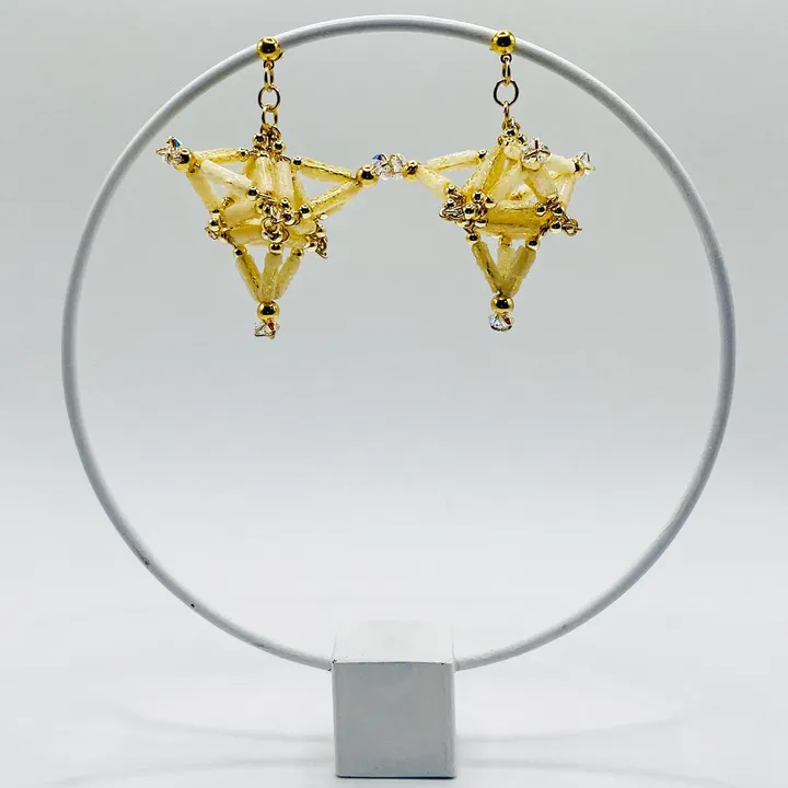 テキスタイルシリーズ◯LaceHandkerchief◯ 細長い竹ビーズを不要になったレースハンカチを使用し、一からビーズを作っています 仕上げにコーティングしているので水に濡れても丈夫な仕様となっています 3DStarよりサイズが小さい為、星屑[Stardust]と名前をつけました 先の方にはスワロフスキーが付いていて 揺れた時に輝きがさらに増すデザインになっています ⁂mUIk UPCYCLE Story⁂ 衣服の大量生産・大量消費が拡大し、ライフサイクルの短期化によって大量破葉に繋がっているこの現状にファッションが大好きな私にとってとてもショッキングなことでした。 ただ捨ててしまう衣服や残布を私もなりにどうにか再利用することができないか考えた時 出来上がったのがこの作品です。 ほんの少しのことかもしれませんが少しでも持続可能なことに貢献できたら幸いです。