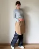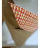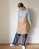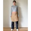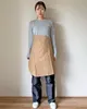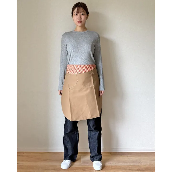 腰から下のショートエプロンines。 エプロン本体にキャメル。 張りのあるしっかりした生地で、裏には色違いの白との2枚あわせです。  おなかの内側には六本木「NUNO」のマドラスチェックに刺繍が施されたレース地。 たまらなくかわいくて愛おしい生地! エプロンそのものは、おむすびのような丸い形の流線形です。 形がユニークなのは、デザインだけではなくて、脇の出っ張りがない分、しゃがんだりしても 床に付かないので汚れにくいのです。 おなか回りは、ゆるやかなカーブを描き立ち上がっています。 これは、水仕事の時などの、水跳ね、油跳ねを防ぐためです。 立ち上がった部分を外へ折り曲げると別の布が顔を見せて、おしゃれ度UP!! それだけでも、家事がグッと楽しくなりますよ! ウエストをゴムと面ファスナー(マジックテープ)が付いたベルトにすることで、腰ベルトのように、からだにフィットしてくれます。 このフィットする着け心地は、今までのエプロンとは全く違う新しい感覚です。 ずれにくく背筋が伸びて快適です。 つけたりはずしたりする持ち手は、手に馴染むようにたまご型をしています。 撥水加工の生地を表と裏の2枚合わせ。 2枚合わせることで、しっかりとサポートしてくれます。 撥水加工でもポリエステルではないので、張りがありつつ柔らかい生地です。