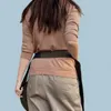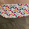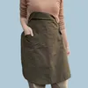 腰から下のショートエプロンines。 エプロン本体に撥水加工生地のモスグリーン おなかの内側にフレンチコットン オレンジリーフプリント エプロンそのものは、おむすびのような丸い形の流線形です。 形がユニークなのは、デザインだけではなくて、脇の出っ張りがない分、しゃがんだりしても 床に付かないので汚れにくいのです。 おなか回りは、ゆるやかなカーブを描き立ち上がっています。 これは、水仕事の時などの、水跳ね、油跳ねを防ぐためです。 立ち上がった部分を外へ折り曲げると別の布が顔を見せて、おしゃれ度UP!! それだけでも、家事がグッと楽しくなりますね! ウエストをゴムと面ファスナー(マジックテープ)が付いたベルトにすることで、腰ベルトのように、からだにフィットしてくれます。 このフィットする着け心地は、今までのエプロンとは全く違う新しい感覚です。 ずれにくく背筋が伸びて快適です。 つけたりはずしたりする持ち手は、手に馴染むようにたまご型をしています。 撥水加工の生地を表と裏の2枚合わせ。 2枚合わせることで、しっかりとサポートしてくれます。 撥水加工でもポリエステルではないので、張りがありつつ柔らかい生地です。