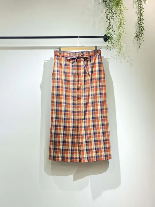 レディな丈のタイトスカート。 フロントは比翼仕立ての釦開きです。歩くたびに裾がスリットのように開き、歩きやすさも考慮しました。 ワッシャー加工により洗いざらした様な表情に仕上げたマドラスチェック生地。 ドライタッチな夏素材ですが、秋のムード漂うノスタルジックなカラーリングで先の季節も意識した素材。 是非セットアップで秋までの展開をおすすめします!!