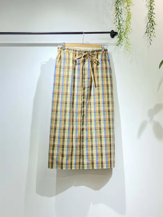 レディな丈のタイトスカート。 フロントは比翼仕立ての釦開きです。歩くたびに裾がスリットのように開き、歩きやすさも考慮しました。 ワッシャー加工により洗いざらした様な表情に仕上げたマドラスチェック生地。 ドライタッチな夏素材ですが、秋のムード漂うノスタルジックなカラーリングで先の季節も意識した素材。 是非セットアップで秋までの展開をおすすめします!!