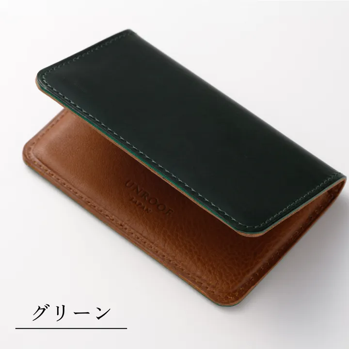 本革名刺入れ(イタリアンレザー) 【ポイント1】美しいフォルムのコンパクト設計 【ポイント2】自社工房ならではのこだわりの染色 【ポイント3】両利き対応のユニバーサルデザイン ◆革職人が追求した美フォルム名刺入れ \「シンプルで美しい」が叶う5つの理由/ 見た目も、革色も、素材も、「美しさ」にこだわって出来上がった今回の名刺入れは、シンプルだからこそ、細部までこだわり抜いて作っています。 1.革の特性に合わせた緻密なサイズ設計 革本来の柔らかさと革表面の美しさを利用し、無駄な装飾をなくすことで薄く・コンパクトな名刺入れを実現。 2.手断ちならではの湾曲設計 UNROOFでは製品サンプルを作るときにまず手断ち(てだち:手で革を切る)で設計しています。 手断ちで設計・成形をすることで、その分手間はかかりますが、ポケット部分の絶妙な湾曲を少しずつ少しずつ角度を変えながら、最も美しく見える角度、湾曲の深さを追求していきました。 3.素材を惜しまない裏張り設計 名刺入れの内装にもすべて本革を使用。ポケットの内部分、裏部分にも革を張り合わせ、開いても美しい見た目をキープ。 素材を惜しまず美しさ最優先で裏張り設計を採用しています。 4.コバ処理 革製品の見た目を大きく左右する重要なパーツ、コバ。(コバ:革の裁断面のこと) このコバをしっかり磨き上げ、さらにトコノール(のり)を革の裁断面に塗ることで、革のほつれや張りあわせ部分のはがれを防いでいます。シンプルだからこそ細部の細部まで丁寧に仕上げていきます。 5.肉盛り(にくもり) そしてシンプルな名刺入れを美しくみせてくれる重要な工程が『肉盛り』という手法を用いた形づくりです。 革本来の柔らかさ、硬さを活かしながら『肉盛り』をし、収納するポケット部分を完成させていきます。 ◆レザーについて 高級イタリアンレザー「マレンマ」×「ミネルバボックス」 上質イタリアンレザーの『マレンマ』からは日本では希少なカラーのブルーを加えたブルー、グリーン、ブラック、バーガンディの4色がございます。 透き通るような奥深い色合いはどこまでも深く、独特な色合いとなっています。 深い色の理由はもともとのオイルレザーであるブッテーロにさらに2倍のオイルをしっかりと染み込ませているため。オイルそのものの深みが綺麗な色合いを表現しています。 重厚で上品な印象を与えるマレンマの内装にはイタリアンレザーのミネルバボックスを選びました。 ■注意事項/その他 ※本製品は天然素材の牛革を使用しており、革が本来持つ色ムラ・キズ・しわなどが見られます。また、入荷時期やロットにより、同じカラーでも色の濃淡が異なります。ムラ・キズ・しわなどは天然素材ならではの個性としてご理解いただけましたら幸いです。 ※画像はイメージです。モニター環境により、実際の製品の色合いと異なって見える場合があります。 ※革は最初硬く、使いにくさを感じるかもしれませんが、使用を重ねるたびに馴染み使いやすくなっていきます。