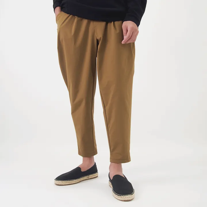 ストレッチ性が高く履き心地の軽いテーパードパンツです。 -デザイン- 腰回りはゆったりとさせながら、足首に向けて自然と絞っていき、気になる体型ラインを隠しながらすらっと見えるようにしました。 ウエストの後ろ半分にゴムを入れることで履きやすさや着心地の良さを持たせつつ、センタータックとウエストベルトによって正面からはすっきりと見えるデザインです。 -生地- ポリエステルのストレッチ糸を100%使用することで適度なハリコシとストレッチ性があります。 生地の重さは137g/㎡程度しかないため、履き心地が軽い素材で、撥水加工が施されているため、水を弾きながらも蒸れにくいという特徴があります。