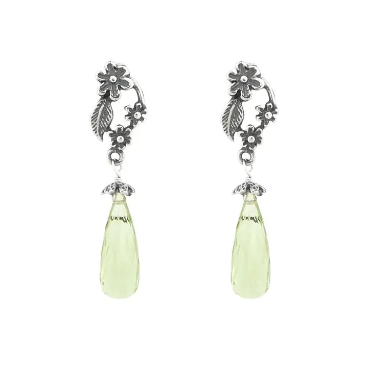 花と枝葉をかたどったシルバーピアス カットの施されたグリーンアメジストが輝きます