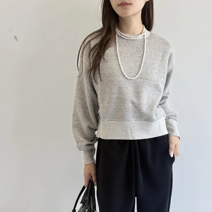 French Terry リヨセル混 ショートレングス プルオーバー リヨセル混で柔らかく少し厚みのあるパイル地を生かしたショート丈のシンプルトレーナー ハイウエストのボトムスでベルト見せもできレイヤードコーデにもすっきりとした印象になります。 重くならないコーディネイトにおススメです made in japan 着丈52cm身巾52cm裄丈78cm コーディネイトのパンツ:ゼロ-グポンチ_ウエストゴム&紐ストレートパンツ ブラック https://goooods.com/products/978d8e4f-f56d-4956-a1d0-9c9db2d8d5e7/c1899bd5-d913-4ca1-8e88-ec61ef2ed8d5 French Terry lyocell コットン100%,リヨセル5%  柔らかさのあるリヨセルコットンの糸を使用し吊り裏毛を彷彿させる膨らみ感を編立で実現しています 両面起毛で程よいハリ感と滑らかな肌触りのある上質な風合いです