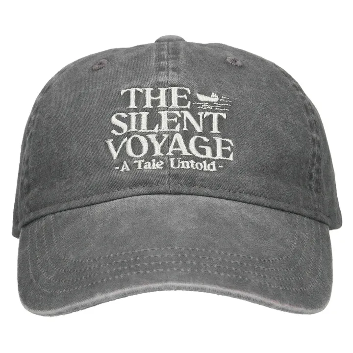 ” 静寂の航海 - 語られざる物語 -”と、架空の映画タイトルの刺繍を入れたキャップ。刺繍カラー はピグメント素材に合わせヴィンテージ感を出しています。