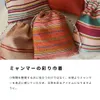 ミャンマーの伝統布「ロンジー」を使用して仕立てた、彩り豊かな巾着です。 今回は、チン族とモン族、それぞれの文化が息づく布を採用。 ■ モン族のロンジー|Orange ミャンマー南東部に暮らすモン民族に受け継がれてきた伝統布。 上部に美しい柄、下部にシンプルな無地を配したコントラストが特徴です。 落ち着きの中に華やかさを感じられる、上品なデザインに仕上がっています。 ■ チン族のロンジー|Green ミャンマー西部に暮らすチン族の、個性的で力強い織り柄が魅力です。 今回は緑をベースにした生地を選び、自然を感じさせる落ち着いた印象に仕上げました。 一枚一枚異なる表情を持ち、唯一無二のデザインをお楽しみいただけます。 どの国にも特有の衣装があり、日本は着物、インドはサリーといったように、ミャンマーの伝統衣装は「ロンジー」といいます。遠い昔から今でも日常的に、ミャンマーの人たちは誇りを持ってロンジーを着続けています。ミャンマーには100以上の民族が存在し、それぞれが独自のロンジーの模様や型を持っています。 ロンジーは細い糸を使った密度の高い織り生地で、さらりとした肌触りが特徴です。 綿100%なので洗うことも可能です。(他のものとわけて水でやさしくつけ置き洗い) ミャンマー女性の雇用創出に取り組む工房にて巾着に仕立てました。 小物類を整理するのに役立つだけではなく、日頃よりミャンマーを身近に感じていただき、日常を彩るアイテムになりますように。 こちらの商品は送料込みとなります。