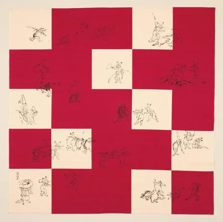 KURUMI(くるみ)シャンタン三巾風呂敷 しっかりとした素材のシャンタンを使用した、三巾サイズの大きな風呂敷です。荷物をくるんで風呂敷としてはもちろん、裾を結んだりしてバッグとしても活用できます。 くるんで掛けて結んで巻いて、インテリアクロスとしても… 幅広く活用できる風呂敷です。 「鳥獣人物戯画」京都・高山寺に伝わる全四巻からなる絵巻物(国宝)。「日本最古の漫画」とも称されています。その中でも最も有名な甲巻の「兎と蛙」が描かれた部分を中心に、絵巻物のイメージも含めてモチーフとした風呂敷です。線描きの繊細なタッチが、布の上でも美しく再現されています。