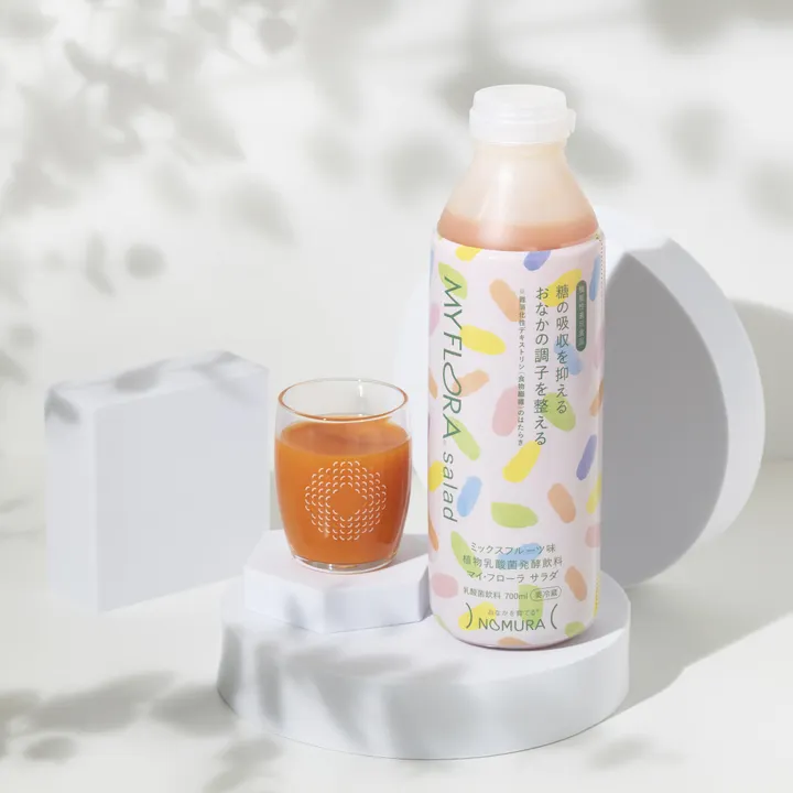 ■【機能性表示食品】糖の吸収を抑える、おなかの調子を整える マイ・フローラ サラダは、ぶどう、にんじん、バナナ、もも、みかん、ビーツ、赤ピーマン、トマトといった果物や野菜を生命力の強い植物乳酸菌で発酵させた腸活ドリンク。食事に合わせやすい、すっきりしたミックスフルーツテイスト。果物と野菜の自然な甘みに乳酸菌がつくる酸味が加わったさわやかな味わいです。甘さひかえめだから、毎日続けやすいと好評です。 【届出番号】H1425 【届出表示】本品には難消化性デキストリン(食物繊維)が含まれています。難消化性デキストリン(食物繊維)は、食事から摂取した糖の吸収を抑えることが報告されています。また、おなかの調子を整える機能があることも報告されています。●食生活は、主食、主菜、副菜を基本に、食事のバランスを。●本品は、疾病の診断、治療、予防を目的としたものではありません。●本品は国の許可を受けたものではありません。