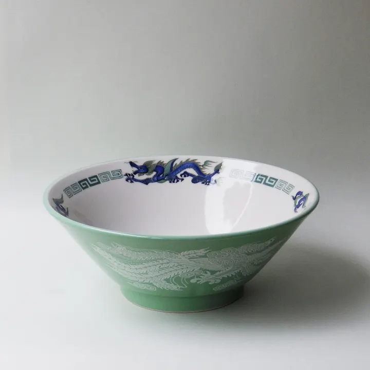 口が広くて浅めなので、スープの香りが立ち、片手で持ちやすく、重ねやすい、飲食店でも愛され続けるどんぶりです。 ■三友製陶所/土岐市駄知 昭和20年、土岐市駄知に創業。どんぶり側面の白龍や觔斗雲は三友製陶所しか出来ない技術で他との差別化を誇ります。デザインは全て下絵付けなので、柄が薄れることなく安心して食器洗浄機もご使用いただけます。有名ラーメン店のオリジナルを製作したり、国際的なラーメンエキシビジョンの丼を手掛け、今ではラーメン丼と言えば「三友製陶所」と言われるほどラーメン業界でも産地でも信頼を得ています。