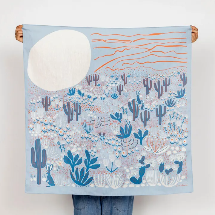 テキサス在住のデザイナー、Leah Duncan (リア ダンカン) とのコラボレーションにより生まれた風呂敷。 デザイナーの生まれ育った地に生える、力強いサボテンの草原がテーマのデザイン。 鮮やかな色合いの中にダイナミックなサボテンが朝日に照らされた爽やかなイメージ。 力強さと品の良さを併せ持つデザインです。 プリントも縫製も全て日本製。 使い方は、スカーフから風呂敷、壁に飾るアートファブリックとしても幅広くお使い頂けます。 Linkならではのコラボレーション風呂敷の品質とデザインを、是非手にとってお確かめください。