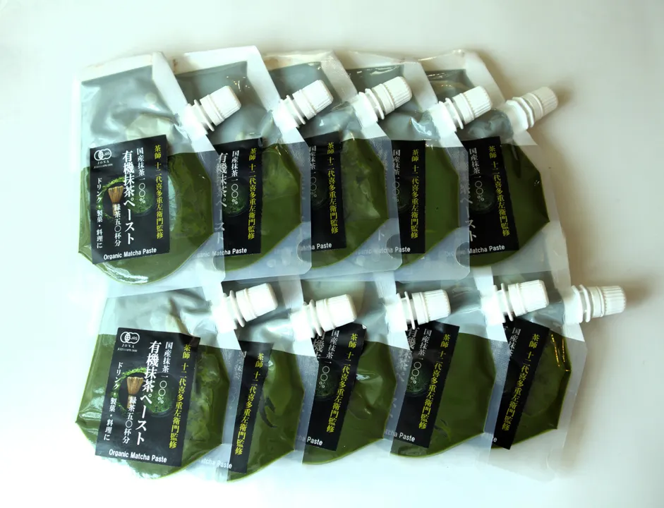 宇治茶師・第12代喜多重左衛門が、スーパーフードの抹茶をもっと手軽に味わってもらいたいと監修開発した練り状の有機抹茶ペースト。 原料は、有機茶老舗・播磨園製茶の有機抹茶と水だけ。 50gの使いやすいキャップ付き透明袋入り。(業務用1㎏入りもあります。) 普段のお茶代わりの抹茶ティが50杯分! 腸活も抜群! 美と健康を求める人に最適! 茶筅・茶道具なしで、簡単に抹茶を味わえます。 これまでの粉の抹茶を溶くのは、面倒という悩みも、これで解決! ミルクに混ぜるだけで、簡単に抹茶ラテができます。 180℃で加熱しても退色せず、緑色をキープするので、抹茶クッキーや抹茶パウンドケーキ等が色鮮やかに作れます。着色料不要です。 抹茶チョコや抹茶プリン等の抹茶スイーツも簡単! 白米を炊く時に、抹茶ペーストを混ぜてスイッチオンするだけで、簡単に緑色の抹茶ご飯ができます サツマイモを蒸かして、抹茶ペーストを入れると、緑色の抹茶きんとんが作れます。 抹茶味噌、抹茶ドレッシング、抹茶カクテル、抹茶ソーダ等、これ一つで色んな抹茶メニューを開発できます。 有機認証取得! 無農薬・無化学肥料・ノーシュガーで、低カロリーなので、ヘルシーで安全。 低カフェインで、子供の成長発達に不可欠な「必須微量ミネラル」の銅を含んでいるので、マタニティフード認定取得。 カテキンやビタミン、ミネラル、食物繊維も含み栄養価が高く、生活習慣病予防に最適! 防腐剤や保存料等、添加物は一切不使用で特殊技術で加工し、加圧加熱殺菌しており、開封前は常温で1年間保管できますが、 開封後は冷蔵保存してください。
