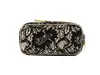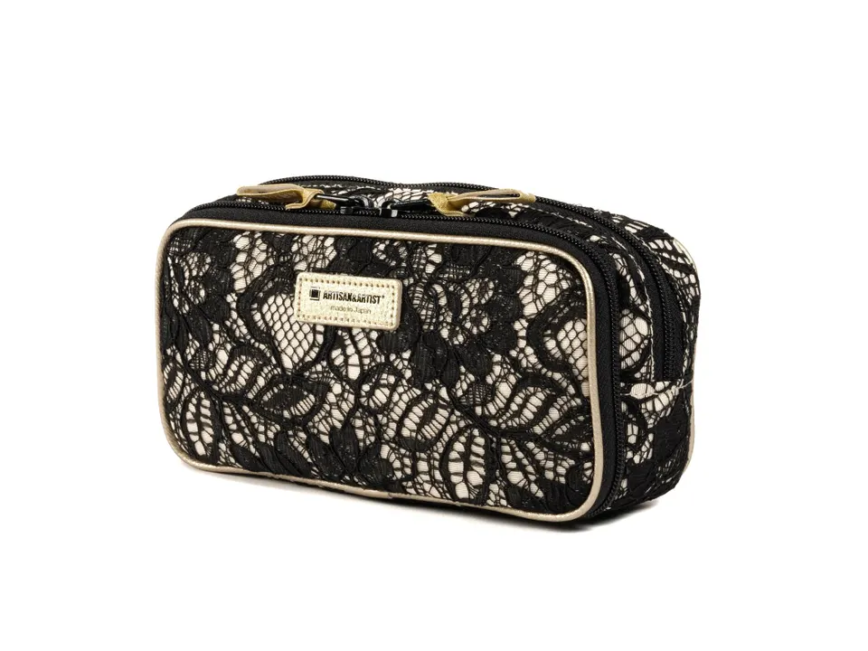 繊細なレースが上品さを際立たせるポーチシリーズ。太さの異なるマットブラック糸を組み合わせて表情豊かに編んだレース柄は、一般的なレースよりもコントラストのある表現力が特徴。 ベース生地の明るく華やかな色調のシャンパンゴールドとの組み合わせにより、品のある美しさが際立つデザインになっています。裏地には表の雰囲気に合わせて、落ち着いたアイスブルーを使用しており、シンプルでシーズンレスです。 メインスペースは、かさばるコスメを立てて収納可能。メイクアイテムとブラシ類の収納スペースを分けることで、スリムながら十分な収納力を実現しました。 メインスペースの両サイドには、ポケットが付いており、一方には2つのリップホルダーと、小さめポケット。もう一方には、全面タイプのポケットがついています。 フロントのファスナーを開くと、4本のブラシホルダー。向かい側のビニールポケットには、ミラーやあぶら取り紙など、薄いアイテムの収納がおすすめです。汚れをふき取りやすい素材なので、ブラシの毛先を傷めずに収められ、粉などの汚れもサッと拭きとれるのがポイントです。