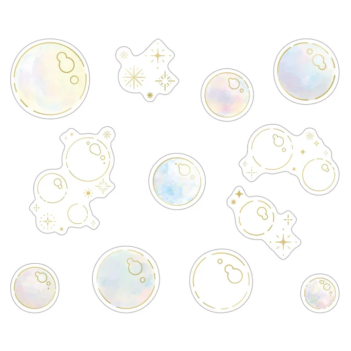 【 キラキラクリアシール Bubble 】 ★★キラキラマステのフレークシール版!  箔押しが魅力の「キラキラマステ」をクリアタイプのフレークシールとして 新たにシリーズ化した【キラキラクリアシール第1弾!】 『ゴールド箔』による、8柄展開★★ 淡い虹色がクリアの素材とマッチしていて とってもかわいいデザイン。 クリアの素材を活かして重ねてはるのもオススメ! 卓上カレンダーにデコレーションすると可愛く仕上がります。 ノートやファイルケースや瓶・クリアボトルなど、 いろんなものを可愛くデコレーションできちゃいます♪ PET素材ならではの【透明度×やわらかさ×粘着】が 紙素材へのデコレーションだけでなく 身の回りの小物デコレーションにも馴染みます♪