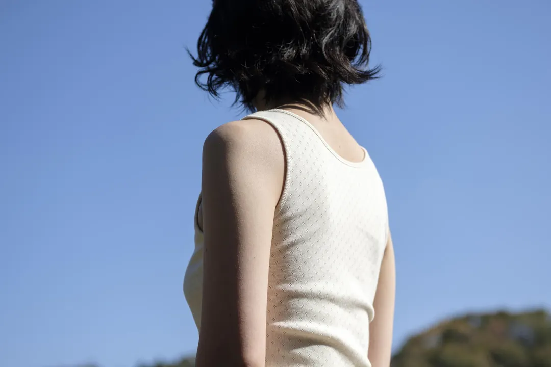マアルの肌着へのこだわり「締め付けない・気持ちいい」をショーツだけでなく上半身でも。 一般的な下着は伸縮性がある廉価な化学繊維の糸で縫いますが、 肌が繊細な人は化繊糸に痒みを感じる人が多いため、独自の方法でオーガニックコットン糸で縫っています。 パッドポケットが内側についているので、 ブラパッド(別売)を入れれば、バストトップが目立たず、ブラジャーいらずで過ごせます。 また、パッドポケットの下にはゴムのようなフィットするものを一切入れておらず、 胸まわりを締め付けたり、汗がたまったり、擦れることがありません。 バスト大きめの方、身長が165cm以上の方、下垂気味の方には、パッドポケットを長めにしているBWタイプがおすすめです。 (約7㎝長くなっています) 品質表示ラベルは、あえて外側に。 取り外しやすいよう、大きめのミシン目で本体の縫い目とは別に取り付けてあります。 これも、肌刺激を減らす工夫です。 地模様のあるオーガニックコットン生地は、伸縮性があり、とても柔らか。 コットンの持つ天然の油分を適度に含んでおり、しっとりふわふわとした感触です。 無農薬有機栽培で育てた綿を、極力化学物質を使わず、漂白も染めも一切せずに、国内で丁寧に編んだ生地です。 綿の栽培から糸づくりまで、世界的なソーシャルプロジェクト=bioRe projectに担われており、 気持ちがいい!と感じた肌着がどこまで遡ってもマアルく気持ちのいいフェアトレードの関係で生まれたものであるようにと願っています。 国内の縫製工場で丁寧に作られています。 サイズ:M(B79~87cm)     M-BW(B79~87cm)     L(B86~94cm)     L-BW(B86~94cm)     (B:バスト) ※バストがDカップ以上の方、身長が165cm以上の方、下垂気味の方はBWタイプをおすすめします。