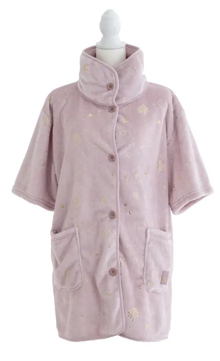 なめらかな手触りのフランネルとあたたかなボアで、うっとりするような夢見心地に。 厚みのあるフランネルとゴールドの箔プリントが人気の冬の定番防寒シリーズです。 今年はキルティングのようなライン模様を忍ばせてみたり、例年よりも柄の密度が高く、キラキラした箔プリントの特徴がより分かりやすくなっています。 ベストが毎年人気ですが、もう少し防寒性が欲しい!けど、家事の時に袖が邪魔になるのは× というご要望にお応えして、7分袖のコーディガンをご提案いたします。 キッチンで温かい飲み物を準備したり、ソファに座って編み物をしたり、7分袖は作業の邪魔にならず、それでいてあたたかさがキープできて大活躍。お風呂あがりの湯冷め防止、休日のリラックスタイムなどにも是非。 袖ぐりを広めに仕立てているので、厚手のセーターやゆったりめのトップス上からでも楽に羽織ることができます。 お尻まで隠れる着丈で腰まわりもあたたかく過ごせます。 襟は立てても開いても◎ フランネル生地は静電気防止糸を使用しているため、不快なパチパチともサヨナラできます。 左右にスマホが入る大きめポケット付き。