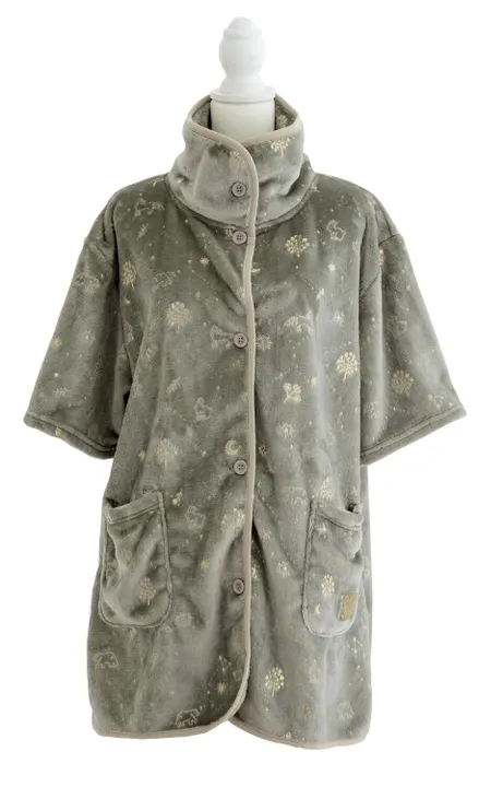 なめらかな手触りのフランネルとあたたかなボアで、うっとりするような夢見心地に。 厚みのあるフランネルとゴールドの箔プリントが人気の冬の定番防寒シリーズです。 今年はキルティングのようなライン模様を忍ばせてみたり、例年よりも柄の密度が高く、キラキラした箔プリントの特徴がより分かりやすくなっています。 ベストが毎年人気ですが、もう少し防寒性が欲しい!けど、家事の時に袖が邪魔になるのは× というご要望にお応えして、7分袖のコーディガンをご提案いたします。 キッチンで温かい飲み物を準備したり、ソファに座って編み物をしたり、7分袖は作業の邪魔にならず、それでいてあたたかさがキープできて大活躍。お風呂あがりの湯冷め防止、休日のリラックスタイムなどにも是非。 袖ぐりを広めに仕立てているので、厚手のセーターやゆったりめのトップス上からでも楽に羽織ることができます。 お尻まで隠れる着丈で腰まわりもあたたかく過ごせます。 襟は立てても開いても◎ フランネル生地は静電気防止糸を使用しているため、不快なパチパチともサヨナラできます。 左右にスマホが入る大きめポケット付き。