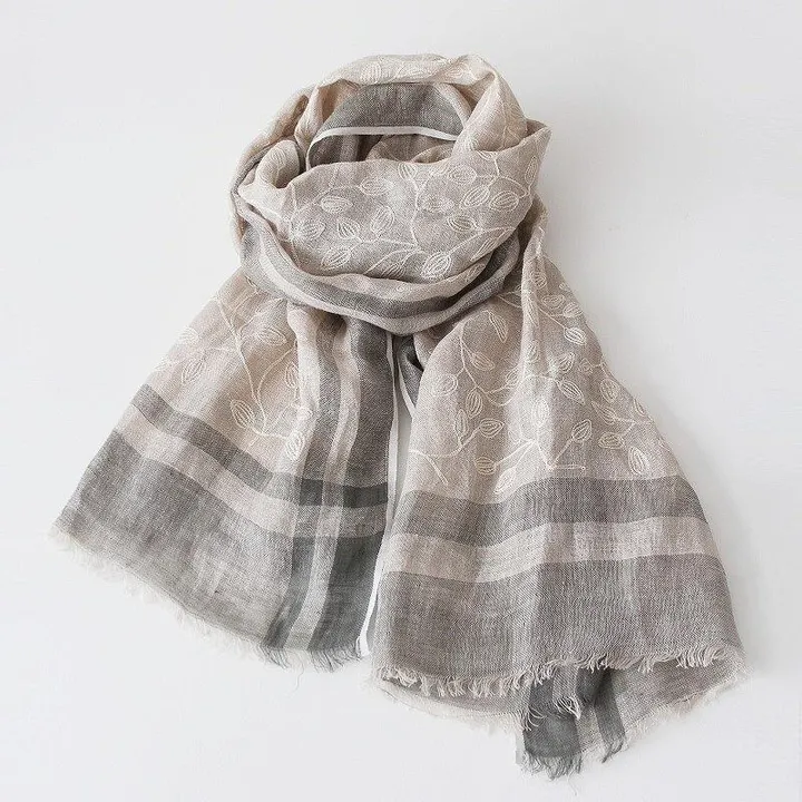 デリケートな首元にもチクチクすることがない上質リネンを使ったオリジナルのリネンストールです。上質で軽やかなリネンは、使い込むほどに柔らかく肌に馴染んでいきます。 ☑ コンセプト 「健康」「環境」「造り」をコンセプトにしたインテリアショップ自社開発のリネン製品 ☑ 天然素材100% 天然素材100%の高品質なアイテムを使いやすい価格で「リネン製品をもっと気軽に」 ☑ 低ホルムアルデヒド 定期的に国内でホルムアルデヒド検査を実施、お子さまからお年寄りまでからだにも環境にも安心 【オールシーズン使える上質リネン】 リネンって夏だけ?と思っている方はサラッとした肌触りながら、やさしい暖かさに驚かれると思います。 あたたかい素材のストールは気分じゃない・・・ 映画館や観劇で肌寒くなってしまう・・・ そんなときも、リネンストールなら重くなりすぎず、季節の変わり目にも重宝します。 もちろん、夏の室内での冷房対策や首元の日焼け防止にも。持ち歩くときは、バッグに結んでしまってもアクセントに。無造作にバッグにつっこんでもなぜかサマになります。 【デザイン】 メインにリーフの刺繍を贅沢に施し、ベースは生成りのリネンの落ち着いた雰囲気にしたデザイン。 リーフの刺繍をくすみ系の色で囲むことで、刺繍の存在感を引き立てました。 ■ネイビー ベースは生成り×ネイビーのデザイン。リーフの刺繍はアイボリーを縫い合わせています。 ■パープル ベースは生成り×淡いボルドーのデザイン。リーフの刺繍はアイボリーを縫い合わせています。 ■グリーン ベースは生成り×淡いセージグリーンのデザイン。リーフの刺繍はアイボリーを縫い合わせています。