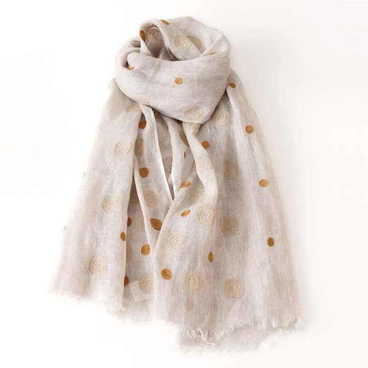 デリケートな首元にもチクチクすることがない上質リネンを使ったオリジナルのリネンストールです。上質で軽やかなリネンは、使い込むほどに柔らかく肌に馴染んでいきます。 ☑ コンセプト 「健康」「環境」「造り」をコンセプトにしたインテリアショップ自社開発のリネン製品 ☑ 天然素材100% 天然素材100%の高品質なアイテムを使いやすい価格で「リネン製品をもっと気軽に」 ☑ 低ホルムアルデヒド 定期的に国内でホルムアルデヒド検査を実施、お子さまからお年寄りまでからだにも環境にも安心 【オールシーズン使える上質リネン】 リネンって夏だけ?と思っている方はサラッとした肌触りながら、やさしい暖かさに驚かれると思います。 あたたかい素材のストールは気分じゃない・・・ 映画館や観劇で肌寒くなってしまう・・・ そんなときも、リネンストールなら重くなりすぎず、季節の変わり目にも重宝します。 もちろん、夏の室内での冷房対策や首元の日焼け防止にも。持ち歩くときは、バッグに結んでしまってもアクセントに。無造作にバッグにつっこんでもなぜかサマになります。 【デザイン】 定番のドット柄は可愛いけど、子供っぽくなりがちです。ベースをアースコンシャスな色にすることで大人っぽく。大きさがランダムなドット部分は刺繍の特徴を活かしてレース模様のように仕上げ、上品な1枚になりました。 ■ゴールド リネンのナチュラルな色をベースにデザイン。ドットの刺繍はライトベージュと山吹色のような濃く深いイエローで縫い合わせています。 ■レッド 万能色のグレージュをベースにデザイン。ドットの刺繍はベースよりも濃いグレージュと真紅のような深みのある赤で縫い合わせています。 ■ミックス オフホワイトをベースにデザイン。ドットの刺繍は白とサーモンピンクと薄花色のような明るい青で縫い合わせました。あえて白のドットを入れ、バランスの良いデザインにしています。 ■ネイビー 3色の糸で織りあげ、デニムのようなブルーを表現。ドットの刺繍はグレーと薄花色のような明るい青で縫い合わせました。青のドットの大きさに変化をつけ、バランスの良いデザインに。