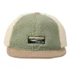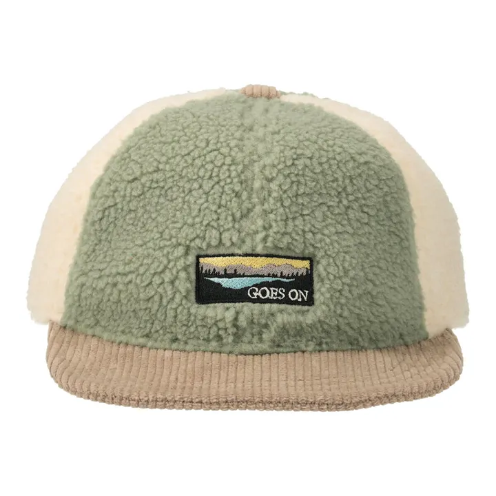 ボア生地を配色で組み合わせ。ツバはコーデュロイ素材のアンパイアキャップ。フロントにはアウトドアモチーフの刺繍ワッペン。ユニセでオススメしやすい淡いカラーリングの帽子です。