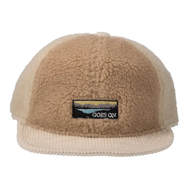 ボア生地を配色で組み合わせ。ツバはコーデュロイ素材のアンパイアキャップ。フロントにはアウトドアモチーフの刺繍ワッペン。ユニセでオススメしやすい淡いカラーリングの帽子です。