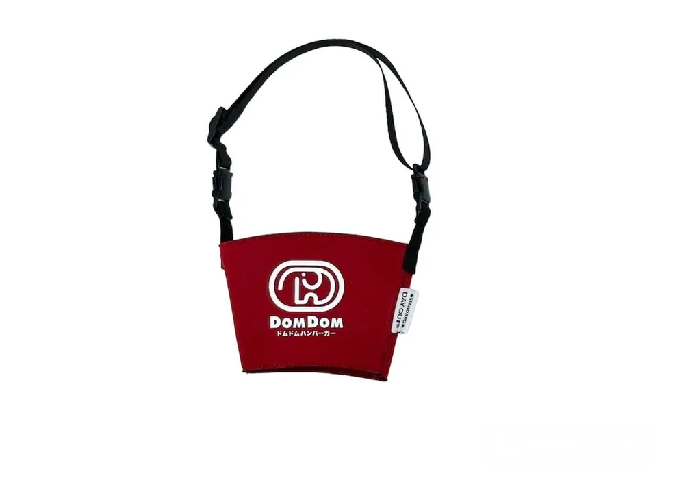 ●「カップドリンクぶら提げるやつ」 テイクアウトカップドリンクを入れて持ち歩けます。 カップドリンクをちょっと置きたい、手を空けたいときに便利です。 テイクアウトカップはホットならスリーブ代わりに使えて、アイスなら結露などのしずく対策にもなります。 ストラップがあるだけで使い勝手がグンとあがります。 例えば雨の日の傘の柄に掛ける、ベビーカーのハンドルにぶら提げる、自転車乗るときはハンドルにぶら提げるなど。 ストラップの根元はゴムがサスペンションのような役割をしてくれるので揺れを軽減してくれます。 ●【ドムドムカップ】 テイクアウトをいれることで結露防止と、多少の保冷効果もあります。 ●【一般カップ】 コンビニなどの一般カップを入れるとこんな感じ。 アイスには結露防止と、多少の保冷効果。 ホットならスリーブ代わりに使えます。 ●ストラップは取り外し可能。 クージーとしても使えます。長さ調整も可能、31~48cmで使えます。 ●サイドにはDAY OUTのコラボピスネーム