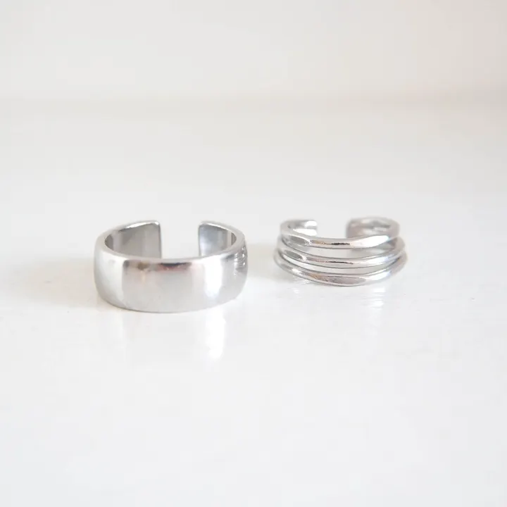 イヤカフ【Multi】/リングとしても使えるイヤカフとミニイヤカフのセット/フラットR+3連ミニイヤカフSV*GD 贅沢なボリュームを自由度高めに装える 1つで主役級の存在感と輝きを放つイヤカフは フリーサイズのリングとしても活躍◎ 時にはじける様だったりふんわりと全体を包み込むようだったり。 金属が放つ贅沢な輝きやボリュームを日常の中で気軽に楽しんでいただきたい… そんな思いを込めておつくりしたこちらのコレクション。 身に着ける楽しみや高揚感で心をいっぱいに満たしてくれるアクセサリーは うっとりと見入ってしまう艶やかなフォルムや 細やかで豊かなテクスチャーの表現など それぞれが職人さんの技術があって実現できたものばかり。 人の手によって生まれるアクセサリーが放つきらりと輝く魔法のような側面も ふとした日常の瞬間に感じてもらえたら嬉しいです。 ◆詳細◆ 大きめサイズと小さめサイズを組み合わせた2本セットのイヤカフ。 それぞれ1本ずつでも重ね付けでも楽しめて、大きめサイズはフリーサイズのリングとしても活躍◎ \大きめサイズのイヤカフ/ ぼってりとした金属の魅力を楽しめるデザインを、フォルムとサイズ感にこだわりオリジナルで原型から制作しました。 メタリックな質感が印象的なフラットなデザインは、程よく幅を持たせることでなめらかな表面の輝きを引き立てます。 凛としたシンプルな佇まいは、さまざまなコーデのアクセントに最適。 イヤカフの端や角の細かな面も丁寧に仕上げており、フィット感も抜群です◎ こちらの大きめサイズのイヤカフも、フリーサイズのリングとしてもお楽しみいただけます。 人差し指や中指などでお楽しみいただきやすい13号を基準としたサイズ感で仕上げています。 \小さめサイズのイヤカフ/ 表面に加工を施した真鍮線を3連に重ねたイヤカフは、耳たぶの上辺りの比較的上の位置にお使いいただけるようなイメージで制作。 内側から外側に向けてグラデーションのように段差をつけることで、軽やかな抜け感を持たせました。 モチーフの内径は小さく、幅は耳に近づくにつれて細くなる形状に仕立てるとともに、内側は中を削り軽量化を図ることで 着用しやすく、また耳への負担の軽減や落下が起こりにくいよう仕上げました。 カラーは、銀白色の輝きが魅力的なロジウムカラーと、 温かみと華やかさに満ちたゴールドカラーの2カラーをご用意しています。 ●片耳用です。 ●大小どちらのイヤカフも口の空きを調整できる仕様ですが、比較的厚みのあるデザインのため、サイズの調整時にやや強めの力が必要です。 調整できる幅は少なめですが、口の空きを小さめに調整してから着用すると着用後に安定し落下防止にもつながり、劣化や破損の不安も最小限です。 ■イヤカフご着用時のご注意■ ◎フリーサイズでお使いいただけるデザインとなりますが、耳の形状には個人差がございますため 装着位置や着用感につきましても個人差がございます。 また装着位置によっては外れやすく紛失の可能性もございますのでお取扱いにご注意ください。 ◎イヤカフの着脱時に力が加わり過ぎますと、変形や破損が生じますのでご注意ください。 特に付ける際は開き過ぎ、閉じ過ぎにご注意ください。 ●こちらの商品は在庫限りで販売が終了となりますのでご了承くださいませ。