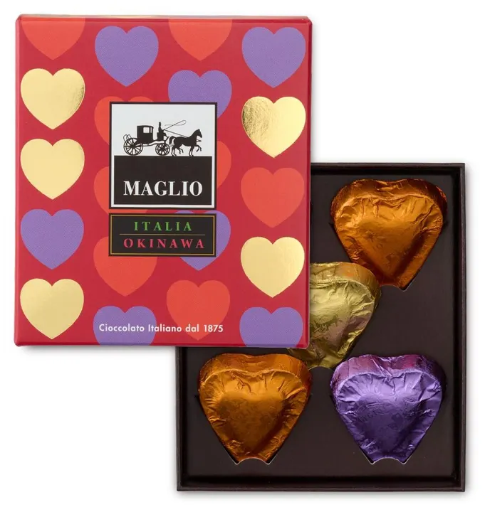 1875年創業、南イタリア・プーリア州の老舗チョコレートメーカー「MAGLIO(マーリオ)」 マーリオの上質なチョコレートに沖縄県・伊江島産の黒糖を合わせたビターチョコレートとミルクチョコレートをハート型に仕上げました。 さらに、イタリア・カンパーニア州産IGP(保護指定原産地)認定のヘーゼルナッツを使用した香り高いチョコレート「ジャンドゥーヤ」を詰め合わせました。 伊江島産黒糖入りのビターチョコレートとミルクチョコレートそれぞれの味わいを各2個、ヘーゼルナッツの特別なチョコレート ジャンドゥーヤを1個詰め合わせた大人のハート型ギフトです。 大切な人へのプレゼントとしてどうぞ。