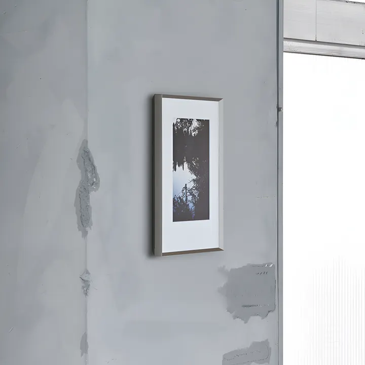 「CUT」と名付けられたこの製品はその名の通り、エッジを切り落として、シャープな印象を携えた額縁です。 シンプルな額縁にあるそれぞれの面がカットされたような形をしています。 このことより、正面から見た時は額による影が作品に落ちず、 額をあまり意識する事なく作品に集中する事が出来ます。 さらに、斜めから見た時は側面が面取り(カット)されているため、 壁面から浮いた様な軽やかな印象と品のある額縁となりました。 「マットシルバー」の表面はショットブラストを採用しマットコーティングを施す事で、 アルミの素材感と高級感を演出しています。 シンプルで、品のあるものを望まれる方には最適な製品です。 2019年グッドデザイン賞受賞、「DFA design for ASIA 2020」受賞