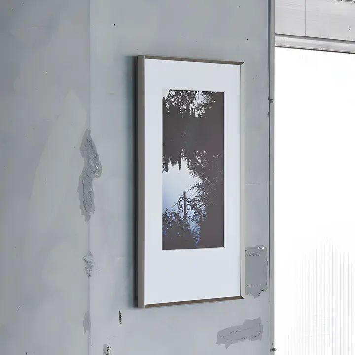 「CUT」と名付けられたこの製品はその名の通り、エッジを切り落として、シャープな印象を携えた額縁です。 シンプルな額縁にあるそれぞれの面がカットされたような形をしています。 このことより、正面から見た時は額による影が作品に落ちず、 額をあまり意識する事なく作品に集中する事が出来ます。 さらに、斜めから見た時は側面が面取り(カット)されているため、 壁面から浮いた様な軽やかな印象と品のある額縁となりました。 「マットシルバー」の表面はショットブラストを採用しマットコーティングを施す事で、 アルミの素材感と高級感を演出しています。 シンプルで、品のあるものを望まれる方には最適な製品です。 2019年グッドデザイン賞受賞、「DFA design for ASIA 2020」受賞