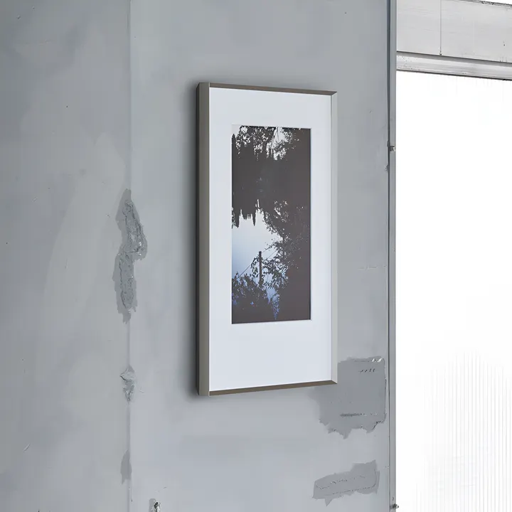 「CUT」と名付けられたこの製品はその名の通り、エッジを切り落として、シャープな印象を携えた額縁です。 シンプルな額縁にあるそれぞれの面がカットされたような形をしています。 このことより、正面から見た時は額による影が作品に落ちず、 額をあまり意識する事なく作品に集中する事が出来ます。 さらに、斜めから見た時は側面が面取り(カット)されているため、 壁面から浮いた様な軽やかな印象と品のある額縁となりました。 「マットシルバー」の表面はショットブラストを採用しマットコーティングを施す事で、 アルミの素材感と高級感を演出しています。 シンプルで、品のあるものを望まれる方には最適な製品です。 2019年グッドデザイン賞受賞、「DFA design for ASIA 2020」受賞