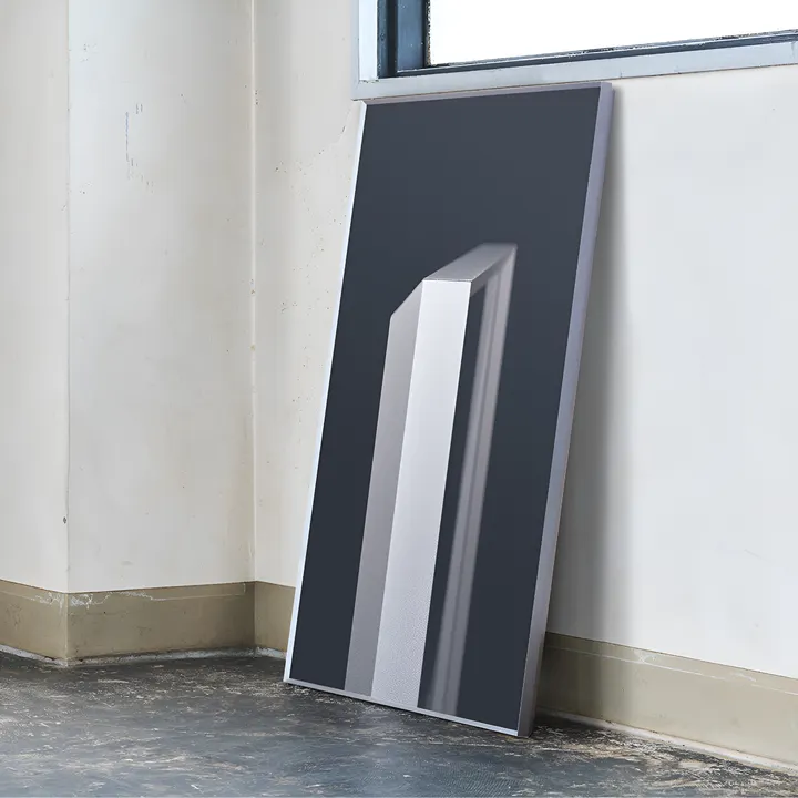 「CUT」と名付けられたこの製品はその名の通り、エッジを切り落として、シャープな印象を携えた額縁です。 シンプルな額縁にあるそれぞれの面がカットされたような形をしています。 このことより、正面から見た時は額による影が作品に落ちず、 額をあまり意識する事なく作品に集中する事が出来ます。 さらに、斜めから見た時は側面が面取り(カット)されているため、 壁面から浮いた様な軽やかな印象と品のある額縁となりました。 「マットシルバー」の表面はショットブラストを採用しマットコーティングを施す事で、 アルミの素材感と高級感を演出しています。 シンプルで、品のあるものを望まれる方には最適な製品です。 2019年グッドデザイン賞受賞、「DFA design for ASIA 2020」受賞
