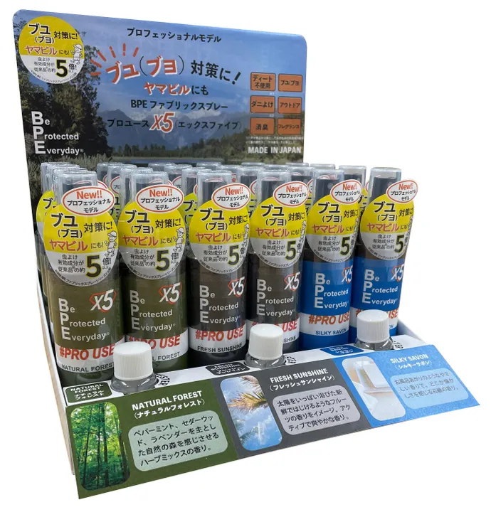 BPEファブリックスプレーシリーズに新登場した、プロユースX5(エックスファイブ)。弊社従来品よりも、虫よけ有効成分が約5倍以上!フレグランス感覚で使える良い香り、消臭効果も他シリーズ同様です。 不快害虫のブユ(ブヨ)対策にご使用いただけます。またヤマビルにも効果的でアウトドア上級者の方にオススメです。 ナチュラルフォレスト:虫よけ・消臭の効き目はそのままに、香りを抑えた微香性。森を感じさせるハーブミックスの香り。 フレッシュサンシャイン:太陽をいっぱい浴びた新鮮ではじけるようなフルーツの香りをイメージ。アクティブで爽やかな香り。 シルキーサボン:お風呂上りのようなふんわりとやさしい香りで香水が苦手な方でも使いやすい爽やかなせっけんの香り。