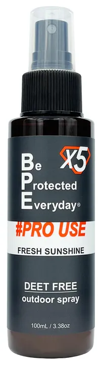 BPEファブリックスプレーシリーズに新登場した、プロユースX5(エックスファイブ)。弊社従来品よりも、虫よけ有効成分が約5倍以上!フレグランス感覚で使える良い香り、消臭効果も他シリーズ同様です。 不快害虫のブユ(ブヨ)対策にご使用いただけます。またヤマビルにも効果的でアウトドア上級者の方にオススメです。 ナチュラルフォレスト:虫よけ・消臭の効き目はそのままに、香りを抑えた微香性。森を感じさせるハーブミックスの香り。 フレッシュサンシャイン:太陽をいっぱい浴びた新鮮ではじけるようなフルーツの香りをイメージ。アクティブで爽やかな香り。 シルキーサボン:お風呂上りのようなふんわりとやさしい香りで香水が苦手な方でも使いやすい爽やかなせっけんの香り。
