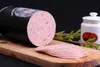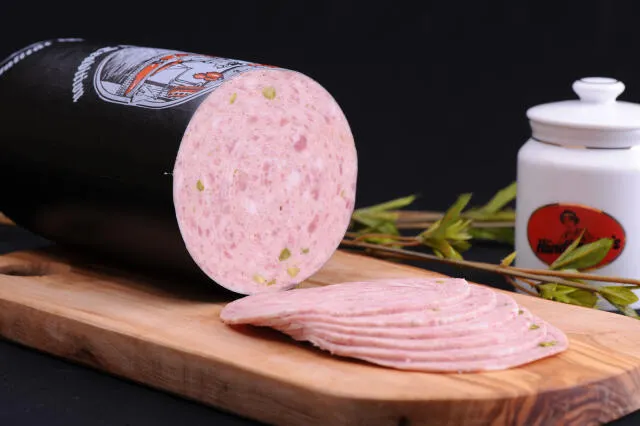 カイザー(皇帝)がヤークト(猟)に持って行くほどお気に入りだったという、粗挽きスライスソーセージ。ピスタチオ入り。 名称:ソーセージ(加熱後包装製品) 原材料名:国産豚肉、食塩、糖類(砂糖、水あめ、ブドウ糖)、香辛料、リン酸塩(Na)、酸化防止剤(V.C)、調味料(アミノ酸)、酸味料、香料、発色剤(亜硝酸Na) 内容量:97g 賞味期限:別途商品ラベルに記載 アレルゲン:乳、豚
