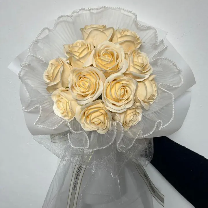 ※プレゼントに最適なソープフラワーの花束です。ほのかに石鹸の香りがする、石鹸素材から作られた造花なので、生花に比べて、長く鑑賞が楽しめます。 ※ソープフラワーとは花びら1枚1枚が石けんでできているお花です。 お花の大きさは生花と変わらない大きさでとっても華やかな上に枯れないので、 大切な思い出を美しいまま長く楽しむことができます。 ※ご注意:ソープフラワーは主に観賞用のみで、入浴剤としてのご使用はできませんので、ご注意ください。 ※金額が記載された書類(納品書・領収書等)は同封しておりません。 ※香りは全て同じではありません。香りが強い場合や弱い場合もあり、時間と共に香りは薄くなる場合がございます。 ※ハンドメイドで一つ一つお作りしてますので、同じものはございません。 ※包装紙は梱包や発送途中にシワや折れ目等が生じてしまう場合がございますが、ご理解いただいたうえ、ご注文をお願いいたします。 ※様々な用途に対応した万能ギフト 誕生日プレゼント、記念日、お見舞い、快気祝い、内祝い、出産祝い、引っ越し祝い、開店祝い、結婚祝いなど、人生の節目に贈るギフトとして多くの方に選ばれています。 また、仏花・供花・お供え用としても使用されるなど、幅広いニーズに応えるアイテムです。 ※ギフトとして: 大切な人へ贈る際にも、ゴージャスな印象を与えることができます。長期間枯れることなく飾って楽しめるため、プレゼントした時の思い出を残したい場合にもぴったりです。 ※母の日や卒業式などの特別な日にもぴったりです。枯れることのない造花なので、長期間保存も可能。お部屋のインテリアとしてもお楽しみいただけます。品質にも自信を持っており、品質保証付きです。大切な人への心のこもった贈り物として、是非ご検討ください。 ※直射日光や高温多湿の場所は避け、風通しの良い場所で保管してください。 豪華プラス・長持ちする枯れない花(Soap flowers)//ソープフラワーとは本物の花を一切使用せずに、香りのよい石鹸素材のみで作られたお花というものです。安いですが、生き生きしており、本物とそっくりですが生花とは違って枯れることがありません。 花粉症の方にも安心な魔法の花(Artificial flowers)//生花と違い、淡い石鹸の匂いがして、細菌の繁殖がなく、この石鹸花は花粉がありませんのですから、お花が好きの花粉アレルギーの方へもいい品物です。アレルギーが心配な方や病室などでも安心して飾ることができます。 手間がかからなく・持ち運びしやすい花束(Gift flowes)//水やりや肥料をあたえるお手入れが不要、ほこりが付いたら軽くティッシュでふき取る程度の手入れをするだけで大丈夫です。