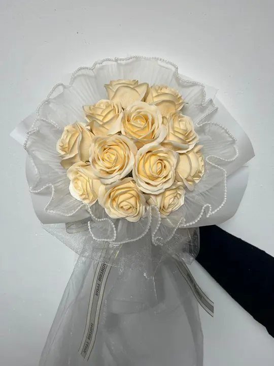 ※プレゼントに最適なソープフラワーの花束です。ほのかに石鹸の香りがする、石鹸素材から作られた造花なので、生花に比べて、長く鑑賞が楽しめます。 ※ソープフラワーとは花びら1枚1枚が石けんでできているお花です。 お花の大きさは生花と変わらない大きさでとっても華やかな上に枯れないので、 大切な思い出を美しいまま長く楽しむことができます。 ※ご注意:ソープフラワーは主に観賞用のみで、入浴剤としてのご使用はできませんので、ご注意ください。 ※金額が記載された書類(納品書・領収書等)は同封しておりません。 ※香りは全て同じではありません。香りが強い場合や弱い場合もあり、時間と共に香りは薄くなる場合がございます。 ※ハンドメイドで一つ一つお作りしてますので、同じものはございません。 ※包装紙は梱包や発送途中にシワや折れ目等が生じてしまう場合がございますが、ご理解いただいたうえ、ご注文をお願いいたします。 ※様々な用途に対応した万能ギフト 誕生日プレゼント、記念日、お見舞い、快気祝い、内祝い、出産祝い、引っ越し祝い、開店祝い、結婚祝いなど、人生の節目に贈るギフトとして多くの方に選ばれています。 また、仏花・供花・お供え用としても使用されるなど、幅広いニーズに応えるアイテムです。 ※ギフトとして: 大切な人へ贈る際にも、ゴージャスな印象を与えることができます。長期間枯れることなく飾って楽しめるため、プレゼントした時の思い出を残したい場合にもぴったりです。 ※母の日や卒業式などの特別な日にもぴったりです。枯れることのない造花なので、長期間保存も可能。お部屋のインテリアとしてもお楽しみいただけます。品質にも自信を持っており、品質保証付きです。大切な人への心のこもった贈り物として、是非ご検討ください。 ※直射日光や高温多湿の場所は避け、風通しの良い場所で保管してください。 豪華プラス・長持ちする枯れない花(Soap flowers)//ソープフラワーとは本物の花を一切使用せずに、香りのよい石鹸素材のみで作られたお花というものです。安いですが、生き生きしており、本物とそっくりですが生花とは違って枯れることがありません。 花粉症の方にも安心な魔法の花(Artificial flowers)//生花と違い、淡い石鹸の匂いがして、細菌の繁殖がなく、この石鹸花は花粉がありませんのですから、お花が好きの花粉アレルギーの方へもいい品物です。アレルギーが心配な方や病室などでも安心して飾ることができます。 手間がかからなく・持ち運びしやすい花束(Gift flowes)//水やりや肥料をあたえるお手入れが不要、ほこりが付いたら軽くティッシュでふき取る程度の手入れをするだけで大丈夫です。