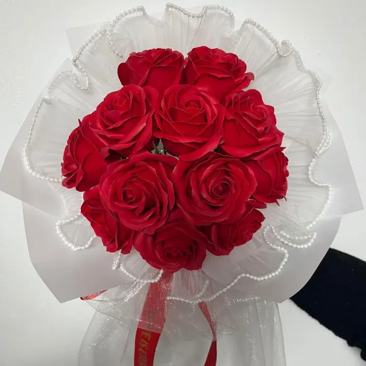 ※プレゼントに最適なソープフラワーの花束です。ほのかに石鹸の香りがする、石鹸素材から作られた造花なので、生花に比べて、長く鑑賞が楽しめます。 ※ソープフラワーとは花びら1枚1枚が石けんでできているお花です。 お花の大きさは生花と変わらない大きさでとっても華やかな上に枯れないので、 大切な思い出を美しいまま長く楽しむことができます。 ※ご注意:ソープフラワーは主に観賞用のみで、入浴剤としてのご使用はできませんので、ご注意ください。 ※金額が記載された書類(納品書・領収書等)は同封しておりません。 ※香りは全て同じではありません。香りが強い場合や弱い場合もあり、時間と共に香りは薄くなる場合がございます。 ※ハンドメイドで一つ一つお作りしてますので、同じものはございません。 ※包装紙は梱包や発送途中にシワや折れ目等が生じてしまう場合がございますが、ご理解いただいたうえ、ご注文をお願いいたします。 ※様々な用途に対応した万能ギフト 誕生日プレゼント、記念日、お見舞い、快気祝い、内祝い、出産祝い、引っ越し祝い、開店祝い、結婚祝いなど、人生の節目に贈るギフトとして多くの方に選ばれています。 また、仏花・供花・お供え用としても使用されるなど、幅広いニーズに応えるアイテムです。 ※ギフトとして: 大切な人へ贈る際にも、ゴージャスな印象を与えることができます。長期間枯れることなく飾って楽しめるため、プレゼントした時の思い出を残したい場合にもぴったりです。 ※母の日や卒業式などの特別な日にもぴったりです。枯れることのない造花なので、長期間保存も可能。お部屋のインテリアとしてもお楽しみいただけます。品質にも自信を持っており、品質保証付きです。大切な人への心のこもった贈り物として、是非ご検討ください。 ※直射日光や高温多湿の場所は避け、風通しの良い場所で保管してください。 豪華プラス・長持ちする枯れない花(Soap flowers)//ソープフラワーとは本物の花を一切使用せずに、香りのよい石鹸素材のみで作られたお花というものです。安いですが、生き生きしており、本物とそっくりですが生花とは違って枯れることがありません。 花粉症の方にも安心な魔法の花(Artificial flowers)//生花と違い、淡い石鹸の匂いがして、細菌の繁殖がなく、この石鹸花は花粉がありませんのですから、お花が好きの花粉アレルギーの方へもいい品物です。アレルギーが心配な方や病室などでも安心して飾ることができます。 手間がかからなく・持ち運びしやすい花束(Gift flowes)//水やりや肥料をあたえるお手入れが不要、ほこりが付いたら軽くティッシュでふき取る程度の手入れをするだけで大丈夫です。