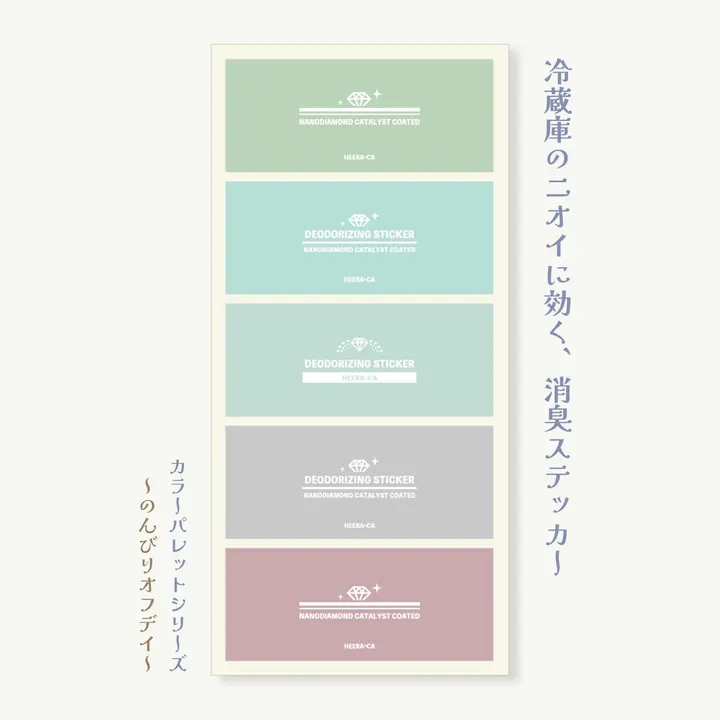 「においけしーる」は冷蔵庫の消臭グッズです。 ・シールだから、場所を取らない&選びません(棚板の裏やドアポケットがオススメ) ・勿論貼らなくても使用可◎ デザイン面が空気に触れる状態で、庫内に保管していただければ消臭が機能します。 ・冷凍庫や野菜室でも利用可能 ・特許取得済み(第7626448号) ・表面に悪臭物質の分解・防臭を促す「ナノダイヤモンド」を塗布しています ・しっかり貼り付き、剥がすときは糊残りなし