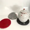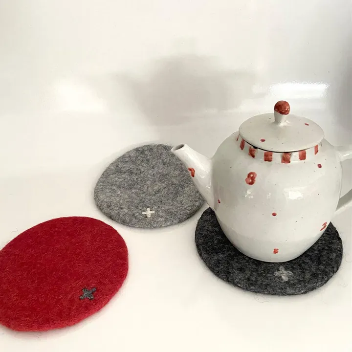 手作りフェルトのポットマットです。丸いフェルトにニードルで北欧風のシンプルなプラスのデザインを入れました。 直径15cmの小さめ、直径20cmの大きめの2つのサイズです。 ひとつひとつ手で作られています。フェルトで作られたポットマットは柔らかく机を痛めませんし、ウールは汚れも染み込みにくいのでポットマットとして最適です。手仕事のあたたかさを感じて、ティータイムが楽しくなります。クリスマスプレゼントや引っ越し祝い、結婚祝いとしてプレゼントするのもおすすめです。 フェルトの制作はすべて手仕事で、羊毛にアルカリ性である石鹸水を含ませてもんだり巻いて転がしたりして縮絨(しゅくじゅう)させ成形します。とても手間のかかる作業です。プラスのシルエット部分は針で何度も刺し、フェルト地にからませていくニードルポイント手法で制作します。ひとつひとつ、少し違う手作り感に愛着がわいてきます。別売りのティーコゼやコースターと合わせてもかわいいです。 *こちらの鍋敷きはウール100%フェルトです。 沸騰したお鍋や急須など(おおよそ100〜120℃程度)には問題なくお使いいただけますが、ウールは自然繊維なので、200℃前後になると焦げや変色が始まります。 オーブンから出したばかりの鉄鍋やスキレットなど、200℃を超える高温のものを直接置くと焦げや変色の恐れがあります。 少し冷ましてからご使用ください。 *手作りの為、多少形に違いがあります。ご了承ください。