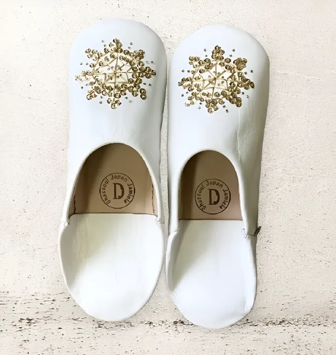 ・バブーシュとは革でできた室内履きです。 ・GJJが革と制作にこだわったオリジナルバブーシュです。 ・モロッコのサハラ砂漠の夜空に瞬く星をイメージして作りました。スッキリしたホワイトにゴールドのスパンコールが輝く素敵な一足です。 ☆革の特長☆ なめし加工を丁寧に行った機械仕上げの羊革のみを使用しております。 革本来の匂いはありますが、獣臭はありませんのでご安心ください。