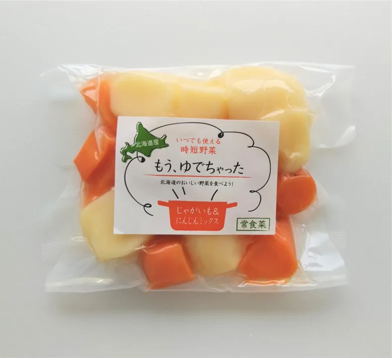 北海道産のメークインと人参をそのままレトルトパックしました。添加物などは使用していません。 使用の効果: ①皮ムキや調理の手間がない ②常温で保管できるのでどこにでも置ける ③熟成芋を使用しているので甘い ④2年間常温保存出来ますので非常食としても最適 など ※本商品は地産地消、省エネ、フードロスなどサステナビリティの思考を取り入れてできた商品です。 用途: 荷崩れし辛いので、カレーや煮物、肉じゃがに。