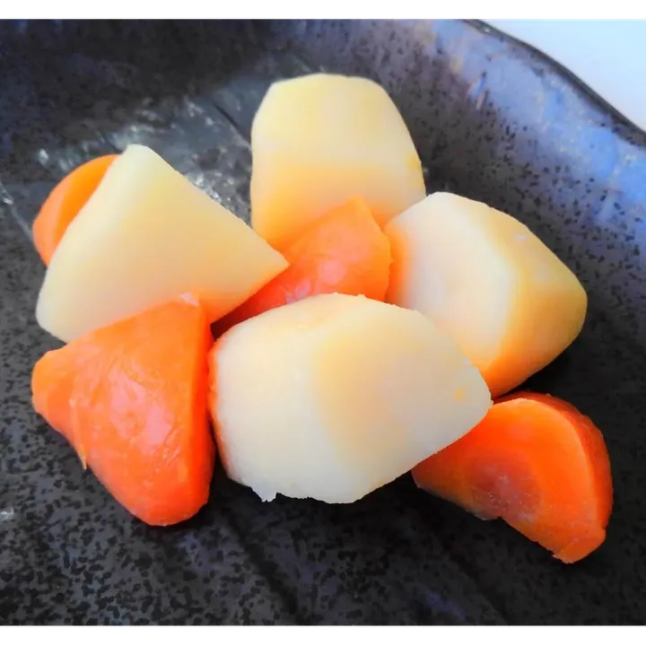 北海道産のメークインと人参をそのままレトルトパックしました。添加物などは使用していません。 使用の効果: ①皮ムキや調理の手間がない ②常温で保管できるのでどこにでも置ける ③熟成芋を使用しているので甘い ④2年間常温保存出来ますので非常食としても最適 など ※本商品は地産地消、省エネ、フードロスなどサステナビリティの思考を取り入れてできた商品です。 用途: 荷崩れし辛いので、カレーや煮物、肉じゃがに。