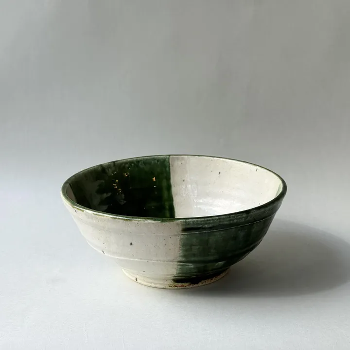その織部と鉄粉入り白色釉薬をかけてモダンに仕上げた平丼。 深めの形状は、うどんなどの麺類以外、煮物・サラダなど普段使いが出来る優れものです。 ■不動窯/土岐市駄知 「ひとつひとつ手作りで、ちょっと変わっても味のある物がモノづくりの基本」の、創業当時からの姿勢を守り、土から器を前向きに作業、素焼き後の絵付け作業、釉薬を丁寧にかける作業など、職人の手仕事で豊かな表情の器を作り続けています。