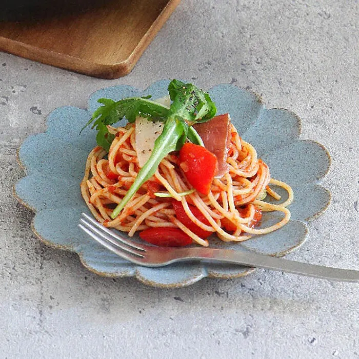 立体感のある花びらのモチーフが可憐な野花シリーズ。 こちらは細かい砂粒を吹き付けたような釉薬が使われています。 不規則なザラザラ感により陰影を作り出し高級感を演出しています。 16センチプレートは取り皿として使いやすいサイズです、また小ぶりな一品ものにもぴったりです。 和洋中、スイーツなどにもシーンを選ばずお使いいただけます。 こちらは美濃地方の窯元で一つ一つ丁寧に作られています。