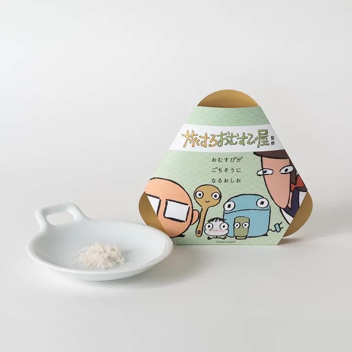 「旅するおむすび屋」菅本香菜さん監修。豊かな自然が残る山口県油谷湾でつくられるミネラルたっぷりで滋味深い海塩を、食物繊維が豊富なスーパーフード「アカモク」と一緒に焚き上げました。もちろん化学調味料は無添加。さらに燻製塩も混ぜ合わせることで”まるでかまどで炊いたような香ばしい味わい”です。 【パッケージ】 ・となりのおにぎり君 笹 スタジオジブリ鈴木敏夫さんによって描かれた「となりのおにぎり君」を全体にあしらったokawari TOKYO限定のデザインです。 【内容量】 65g 【全成分】 海水(山口県)、アカモク 【サイズ】 高さ120mm×幅130mm×奥行き20mm 【賞味期限】 なし