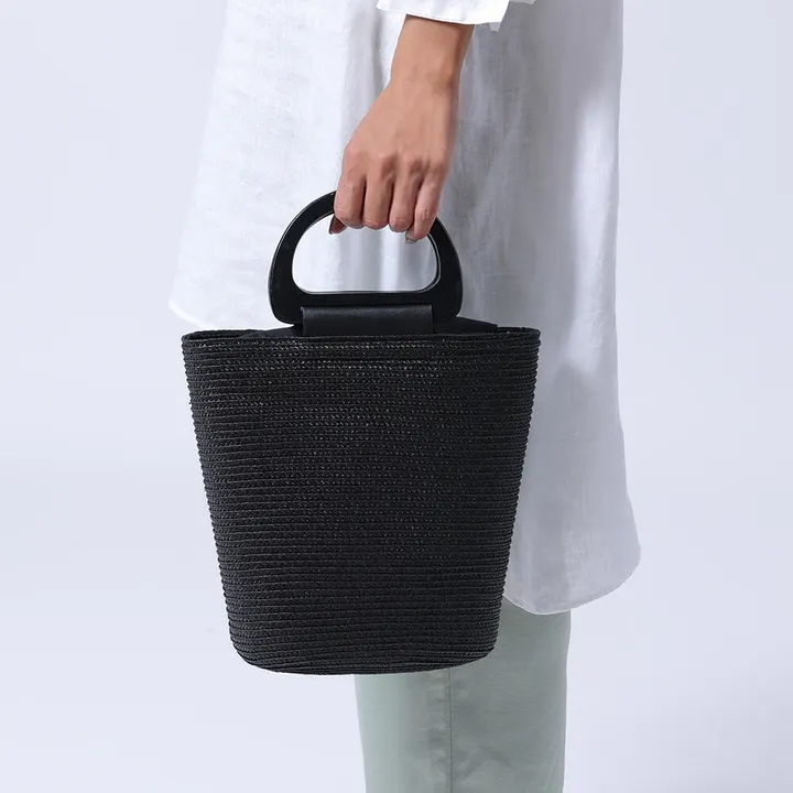 軽さがうれしいポリプロピレン素材のバッグには握りやすいラウンド型のウッドハンドルを採用しています。コーディネートし易いシックな色合いと上品な光沢が、大人の女性や母の日のギフトにもピッタリです。外出時に物が増えても容量にゆとりが出るよう、開口部はカーバー布を付けています。財布にスマホ、化粧ポーチ、真夏のお出かけ時に買った飲み物(ペットボトル)を入れても、上から被せるだけで中身が見えにくい安心仕様です。