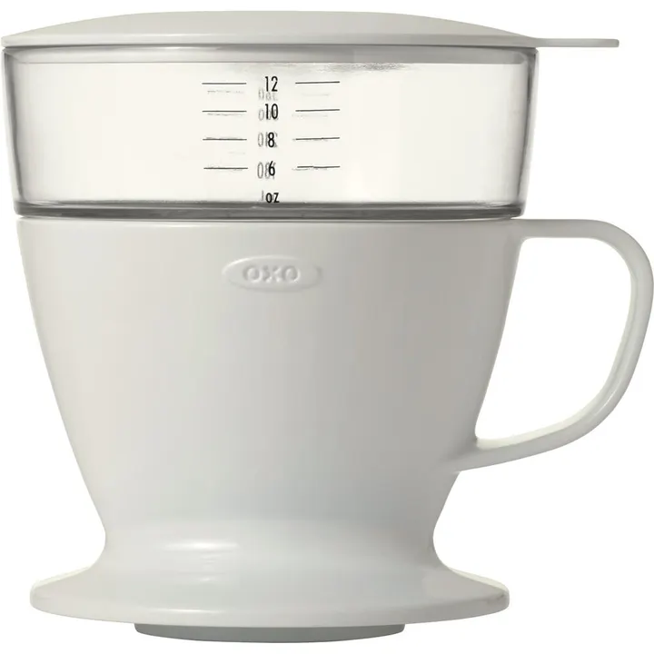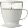 タンク底面の穴は、少しずつ注がなくてもお湯が自動で最適なスピードで注がれるよう設計されたデザイン。注ぐ湯量の目安になる、透明のタンクについた目盛り。理想的な抽出時間でコーヒーができるよう設計。 抽出中に温かさをキープできるフタは、抽出後のドリッパートレイとして使用可。