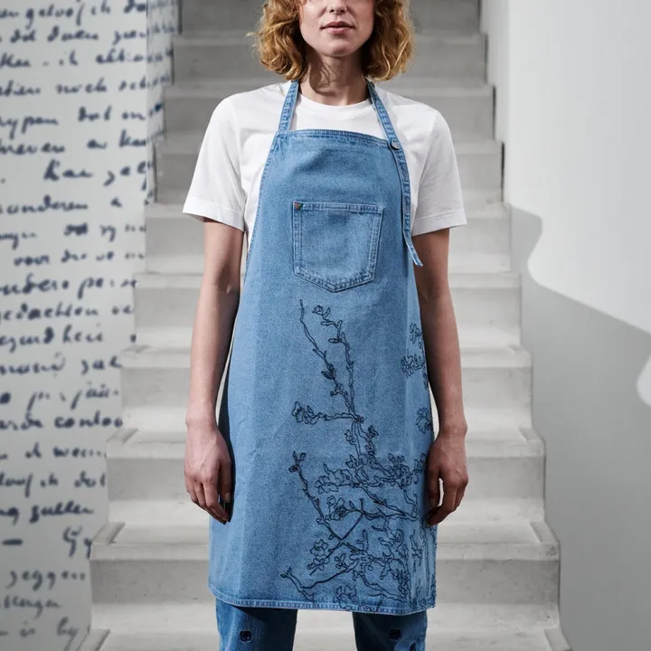 ブロッサムブルーカラーのヴァンエプロン。 ヴィンセント・ヴァン・ゴッホの絵画「アーモンドの花」にインスパイアされた花の刺繍が施されています。 胸元にはジーンズポケットがあり、首とウエストのボタンストラップは調節可能です. 《最小発注数について》 在庫あり商品の場合は1本~可。海外発注の場合は同ブランド商品10本~可。 こちらの商品は一部要海外発注となります。